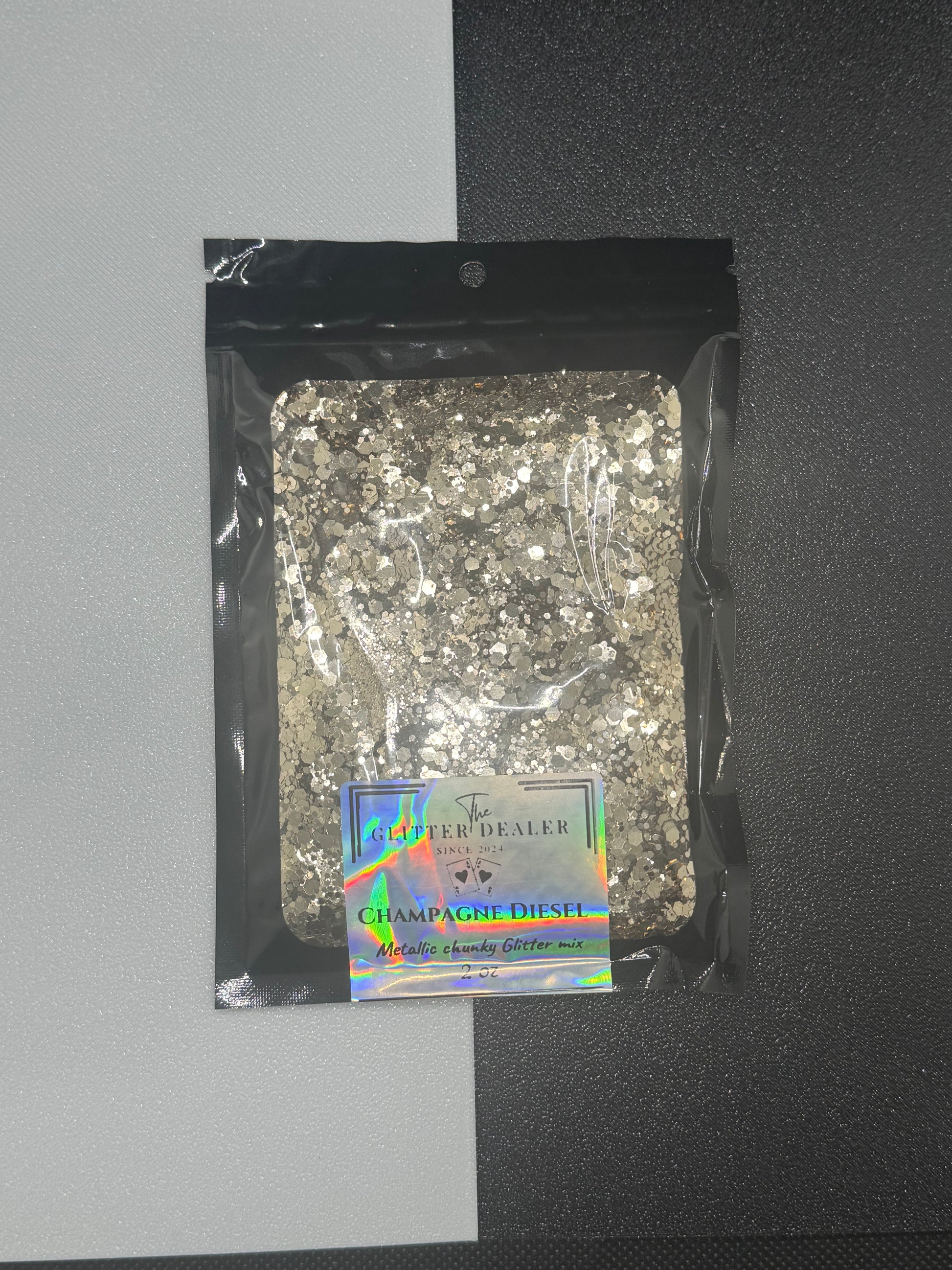 Champagne Diesel is a lovely champagne gold metallic glitter with beautiful gold and beige undertones. The chunky glitter adds a touch of elegance and sparkle to any look. Perfect for adding a pop of color and dimension to your projects. With its unique blend of teal, green and blue hues.