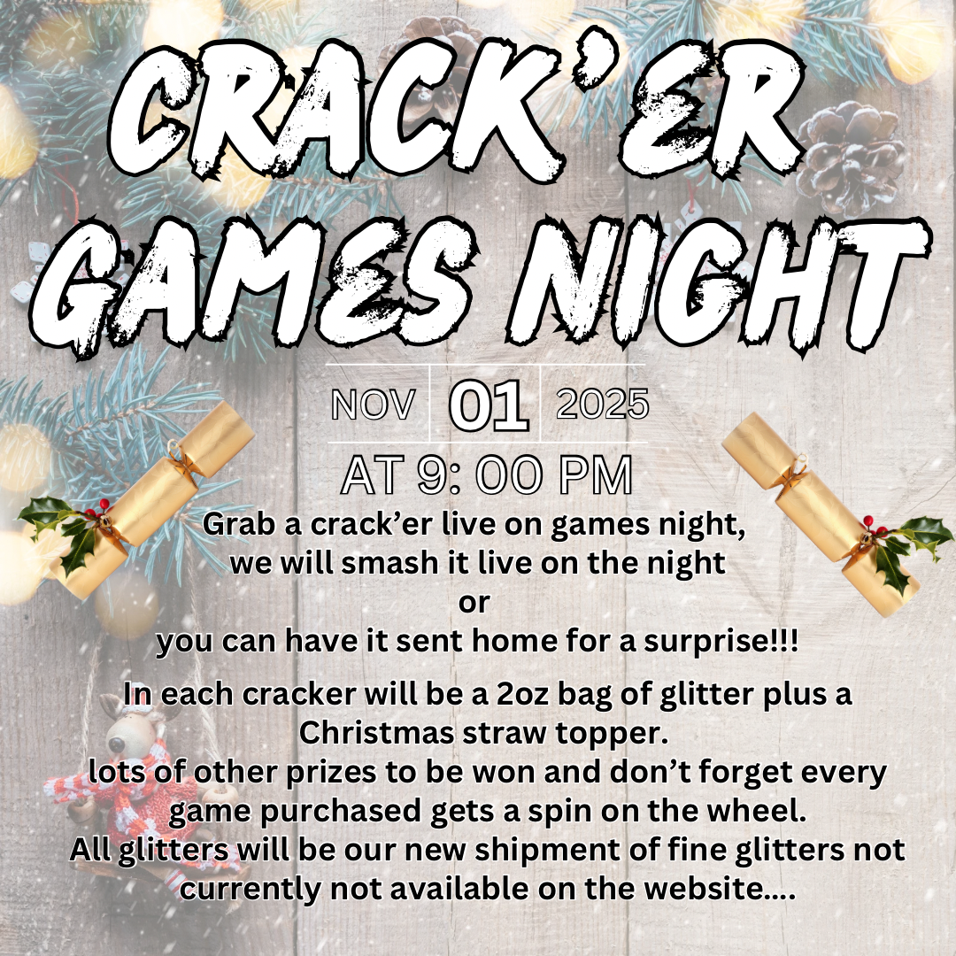 These can be purchased for our Games night which the next one is the 1st November 2025 at 9pm on our TikTok account @theglitterdealer, or you can have us do a video which will upload to our socials, lastly we can just send the crack’er home.
