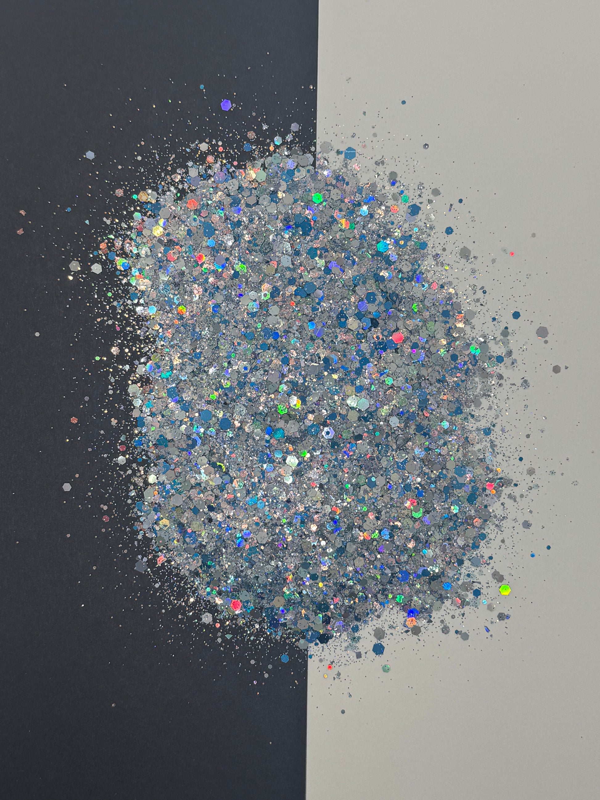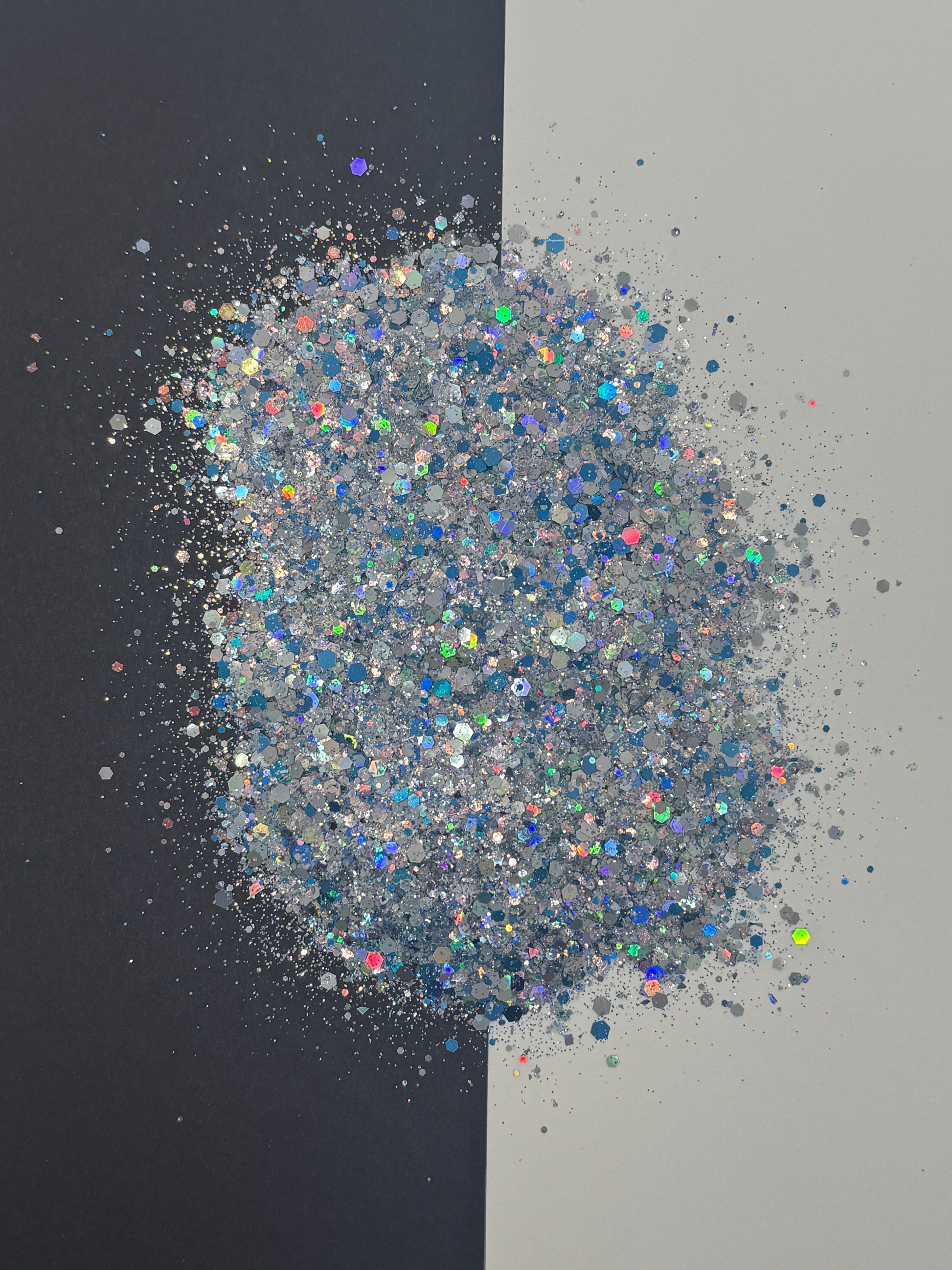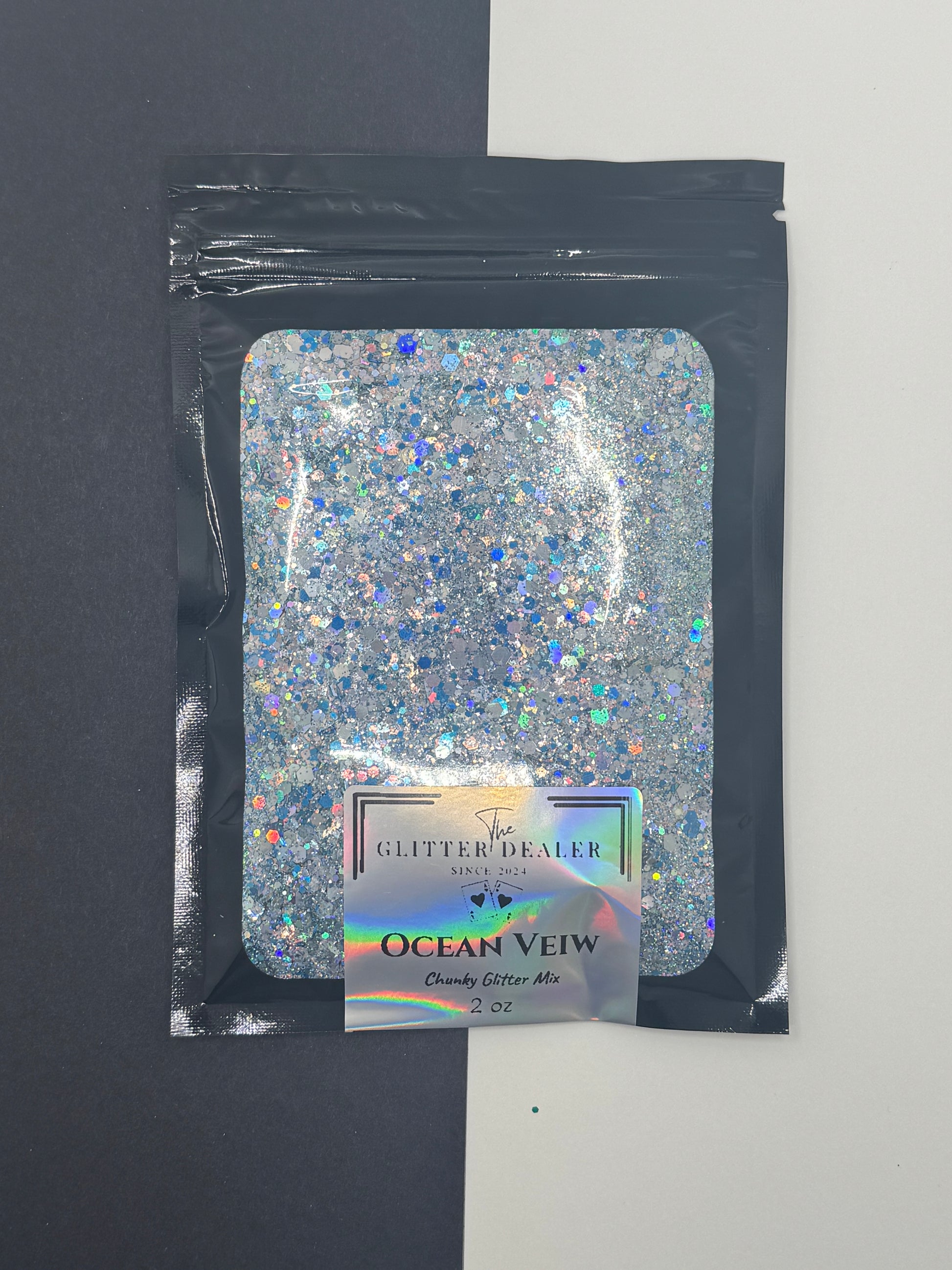 Introducing Ocean Veiw, a dazzling blend of blue silver holographic iridescent hexagonal glitter flakes, featuring four sizes of glitter, that will add a touch of enchantment to any project. With a sparkling finish, this mix is perfect for adding a touch of glamour to your crafts. Elevate your creations with this magical blend today.