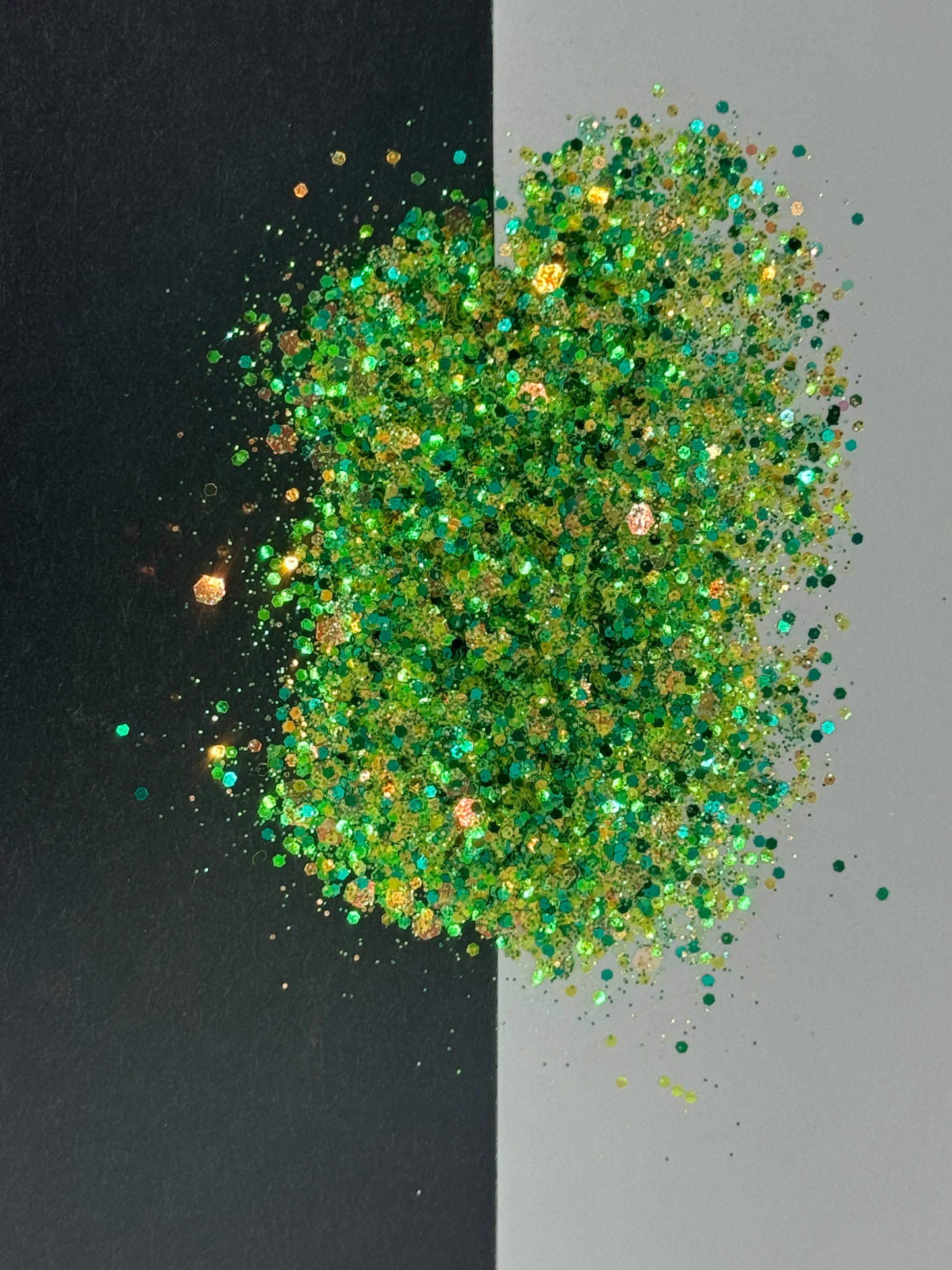 Discover the mesmerizing effects of Sour Tsunami. This unique product features a striking yellow green hexagonal glitter mix with an iridescent colour shift. Create eye-catching looks with this vibrant and dynamic addition to any projects.