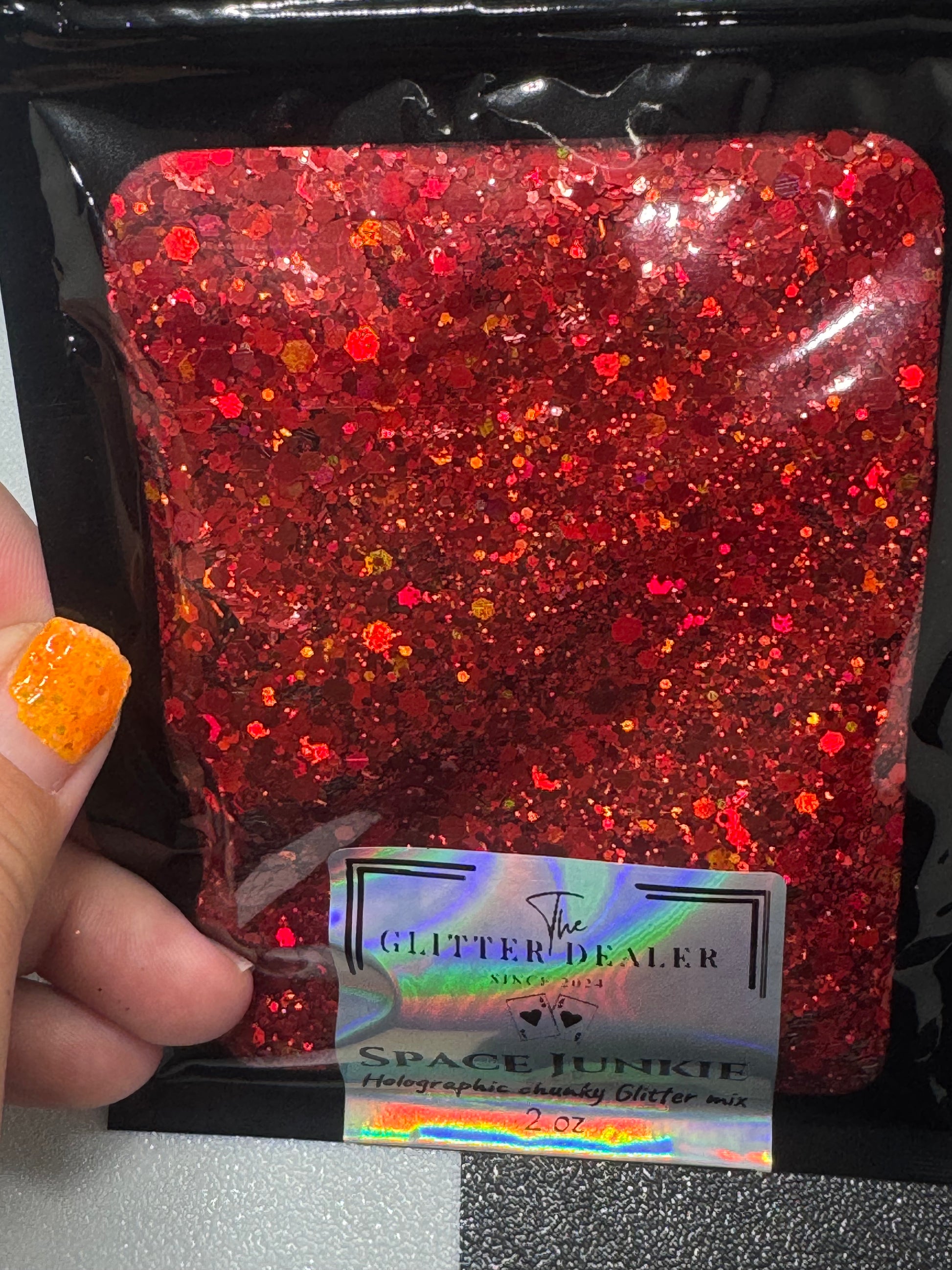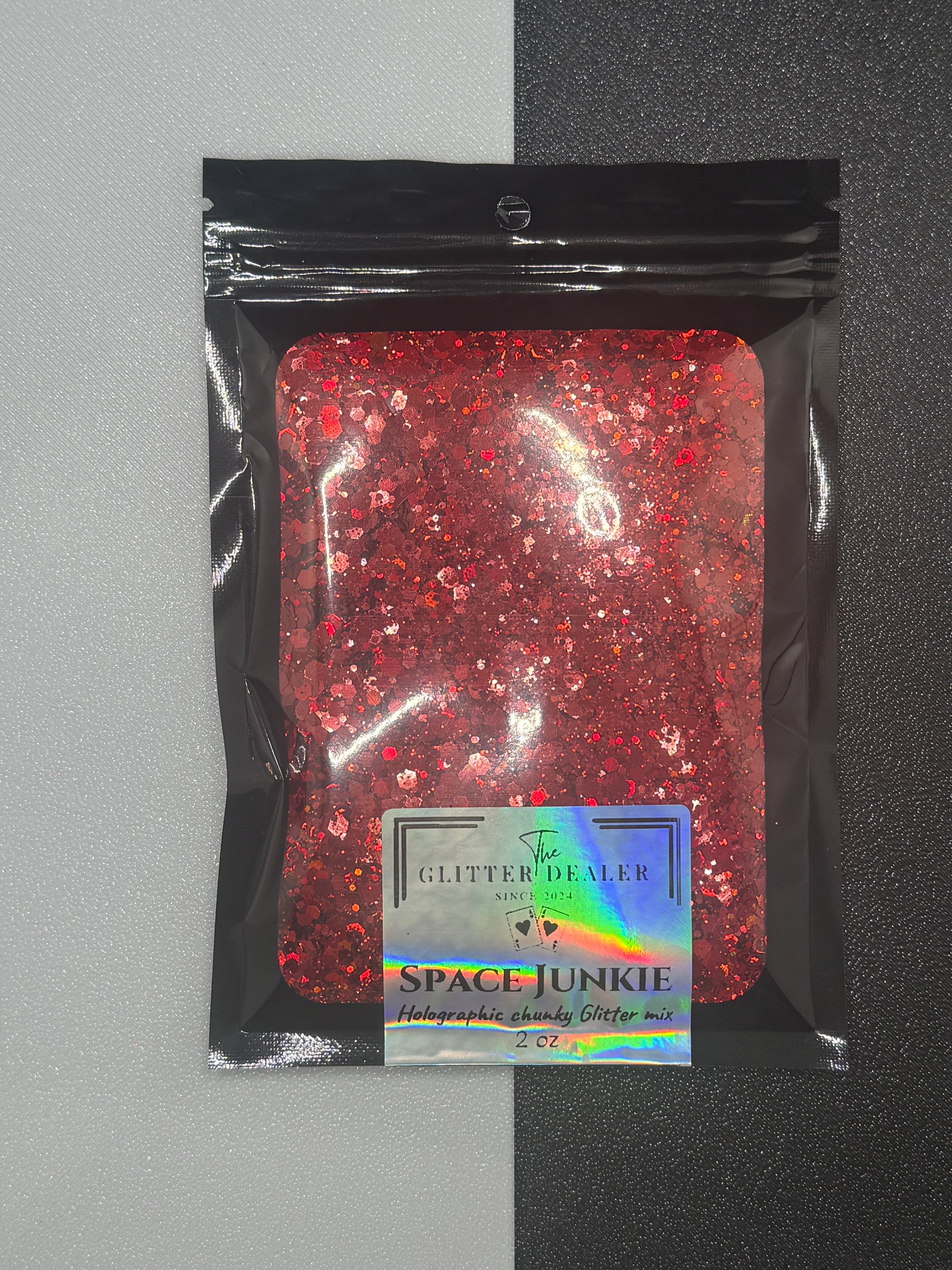 Experience a dazzling display with Space Junkie holographic hexagonal chunky glitter mix. This unique blend sparkles and shines, adding depth and dimension to any project. Perfect for adding a touch of magic to your creations.