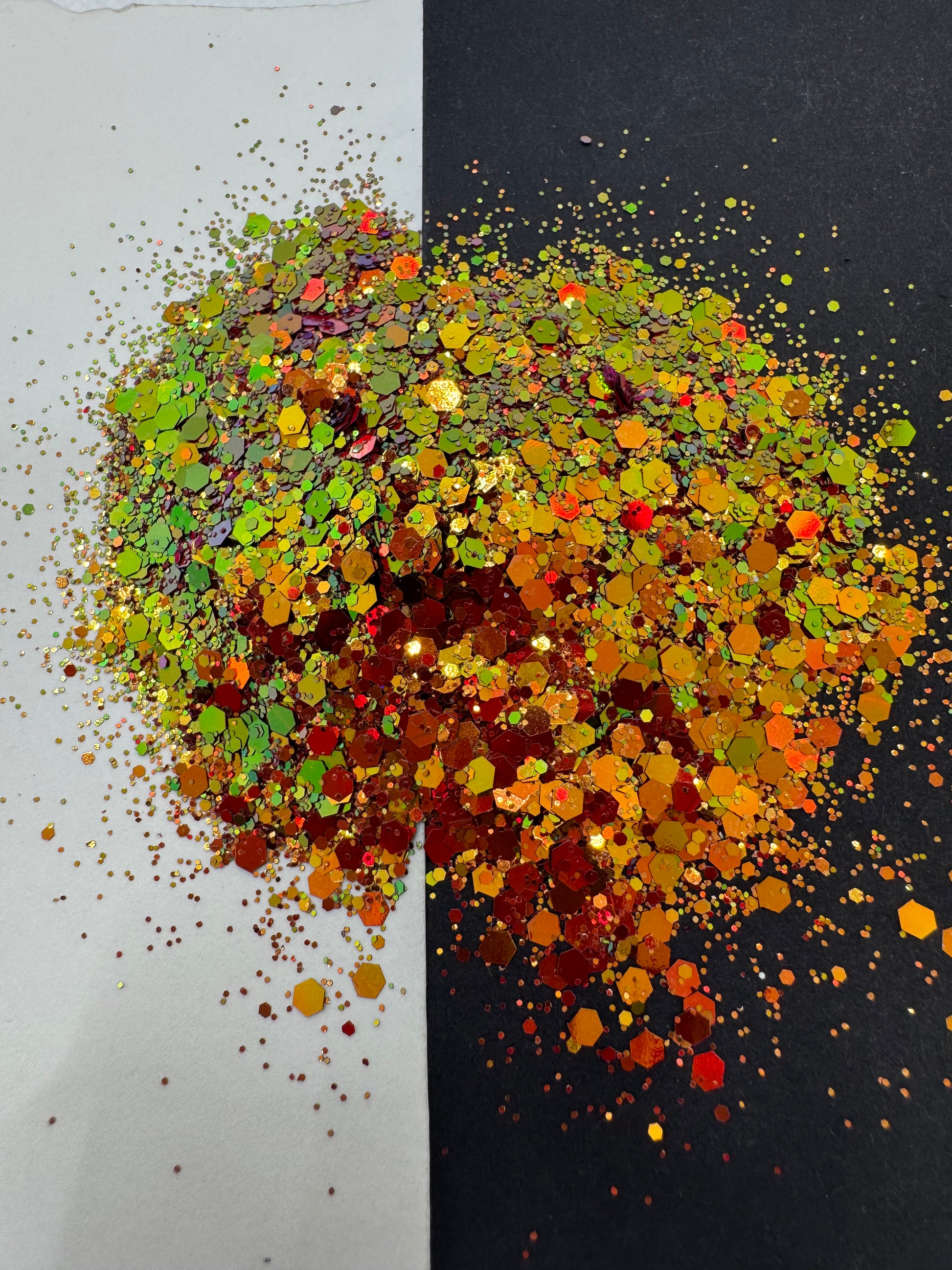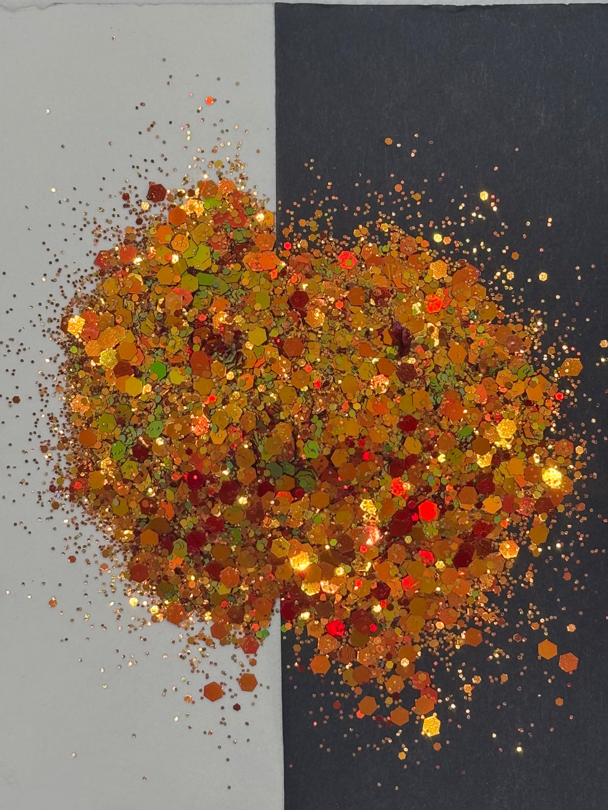 Steam Punk has a colour shift of copper, orange, gold red hues in a chunky glitter mix.