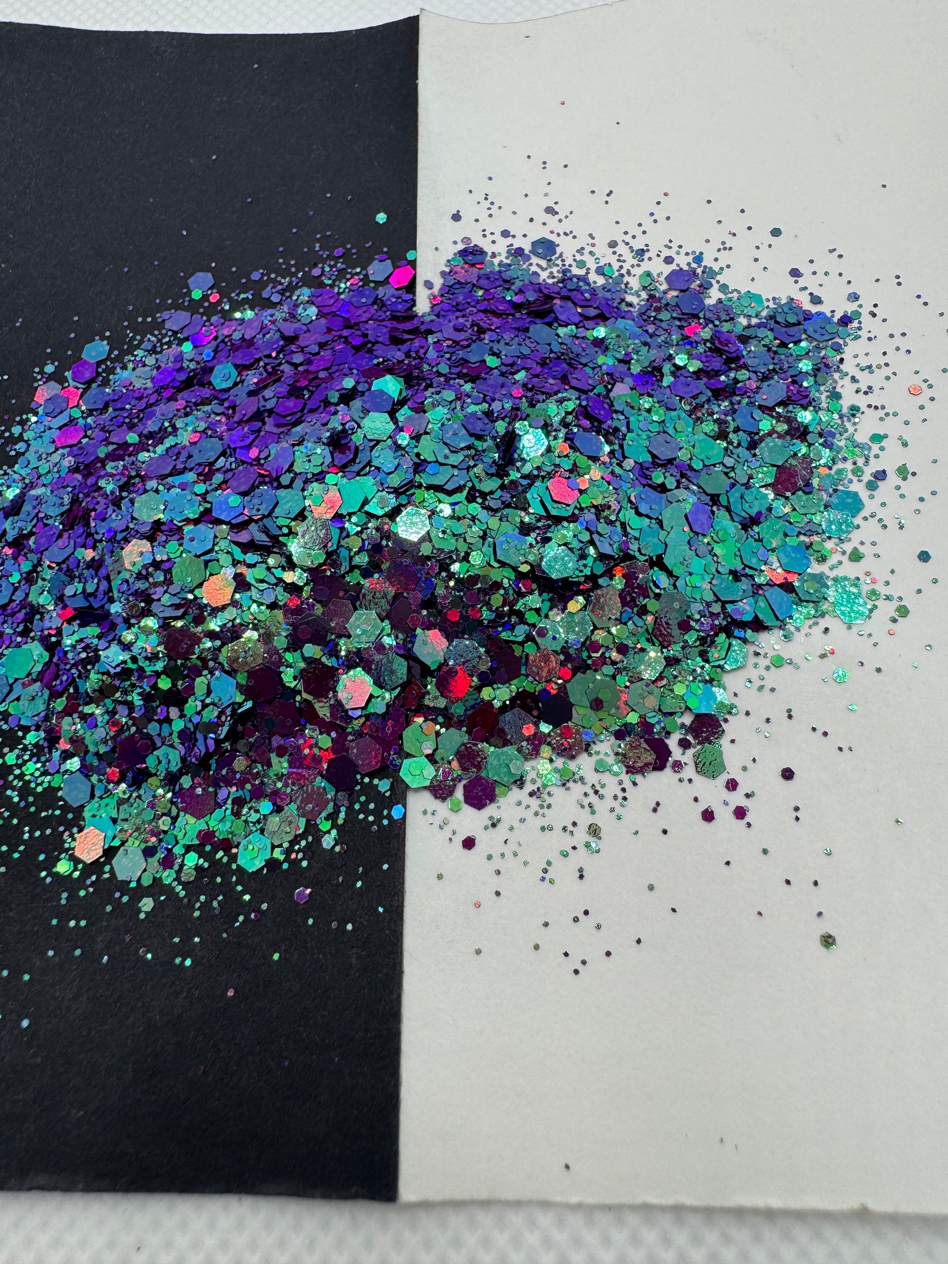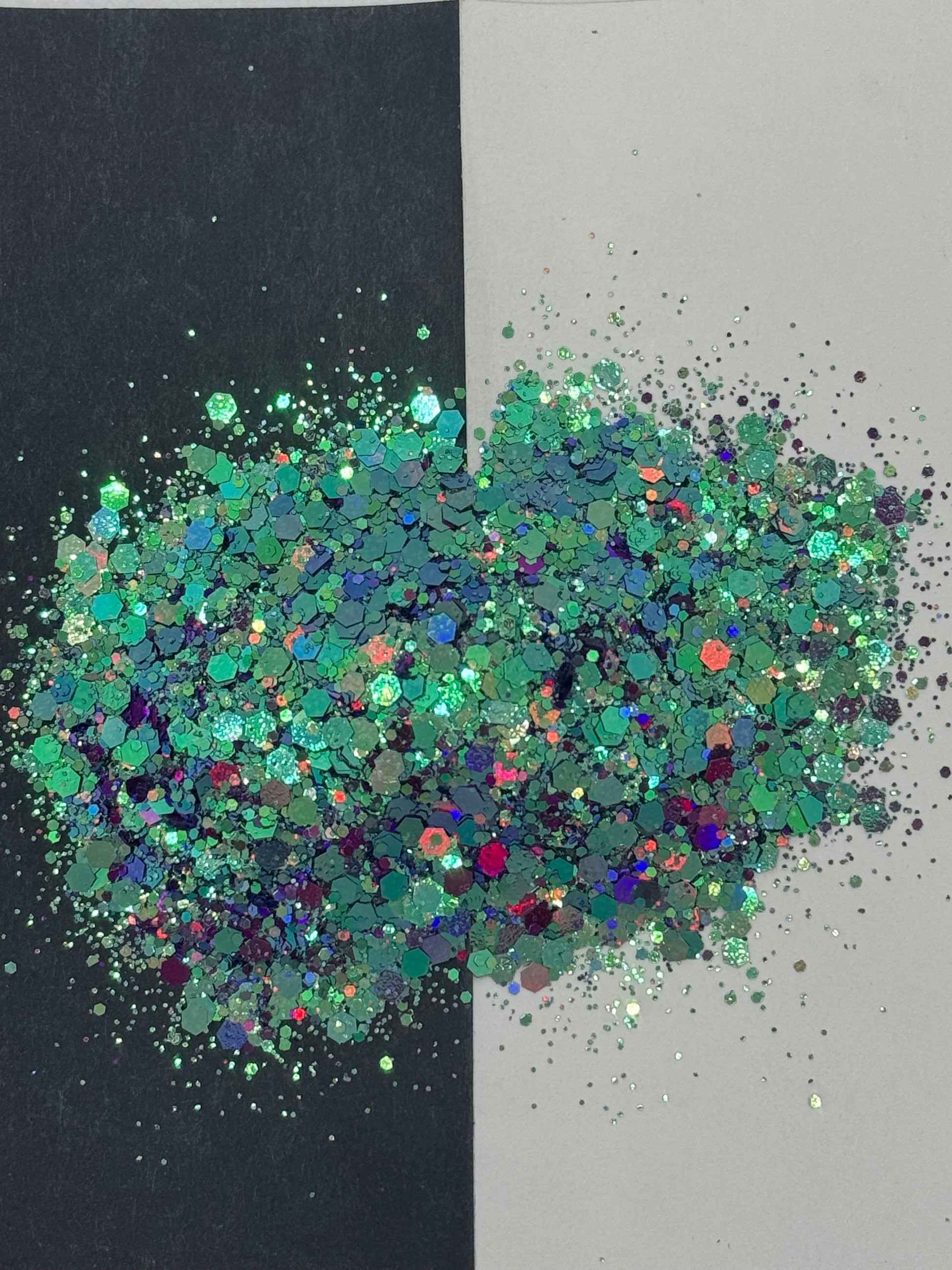 Time Travellers Treat has a colour shift of green, blue, purple hues in a chunky glitter mix.